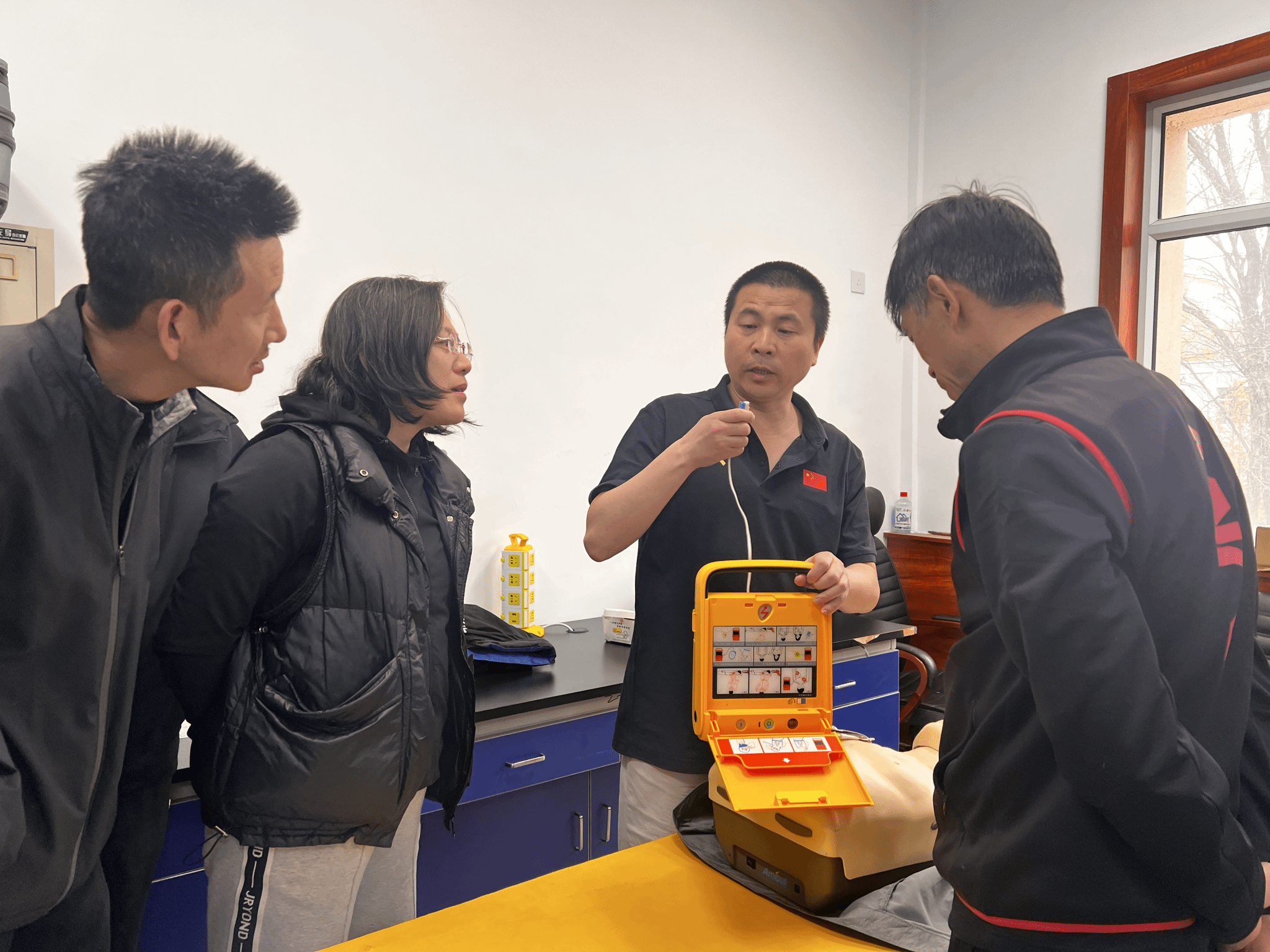 培训围绕自动体外除颤器(AED)与心肺复苏(CPR)操作规范展开,通过理论讲解、现场示范、实操等形式,系统介绍了心搏骤停应急处置、“黄金四分钟”急救原则、AED使用流程等关键内容。培训讲师结合体育教学场景,详细演示了胸外按压、人工呼吸、电极片粘贴、设备开机分析等步骤,并对参训教师在实操中出现的问题逐一纠正指导。
